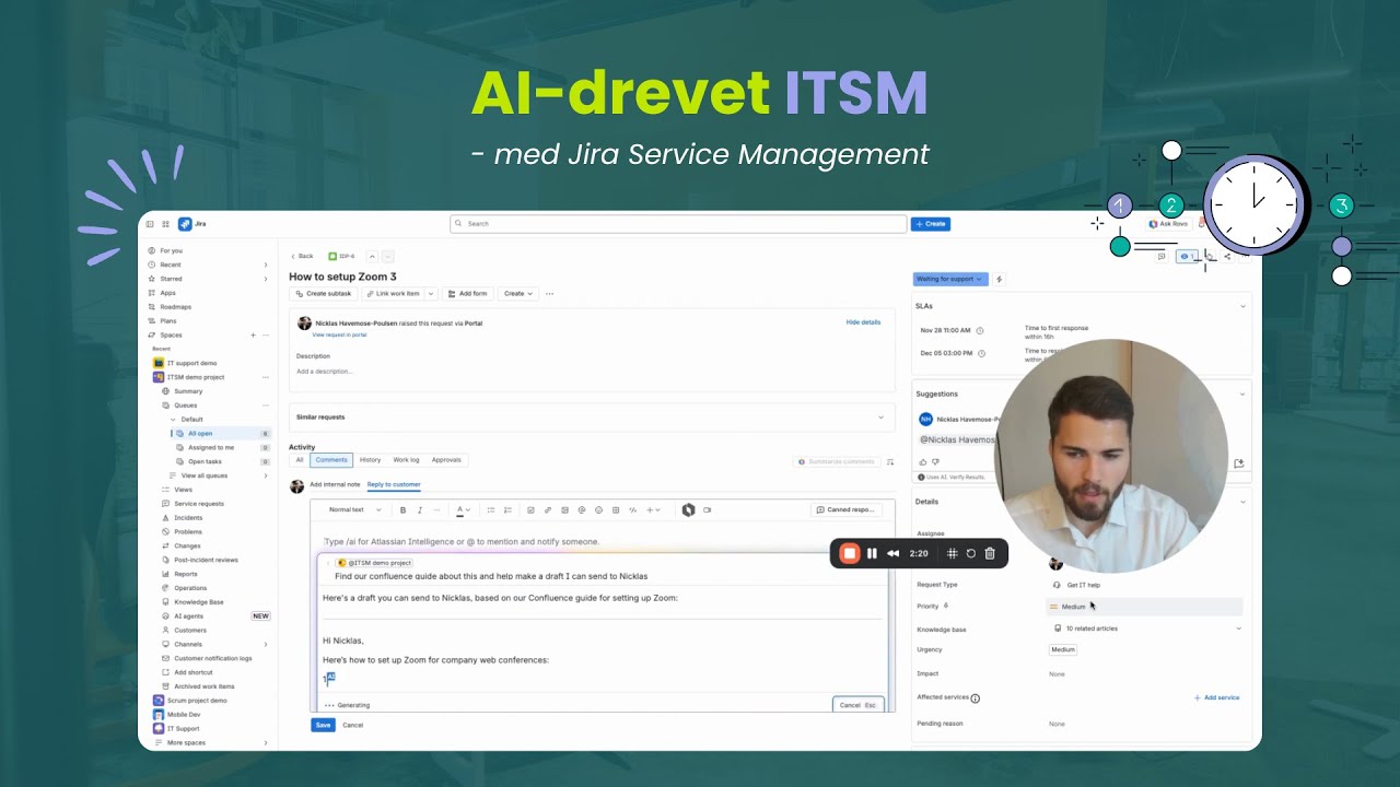 I en tid, hvor IT-afdelinger konstant skal levere mere med færre ressourcer, er effektivitet nøgleordet. Uanset om det handler om at løse indviklede problemer eller besvare rutinemæssige anmodninger, er hastighed og præcision afgørende for brugeroplevelsen. Her kommer Atlassian Rovo ind i billedet. Som Atlassians nye AI-assistent er Rovo designet til at transformere måden, dit ITSM-team arbejder på i Jira Service Management (JSM). Ved at integrere kunstig intelligens direkte i jeres supportprocesser, kan I reducere svartider, øge kvaliteten af besvarelser og frigøre jeres agenter fra gentagne opgaver.