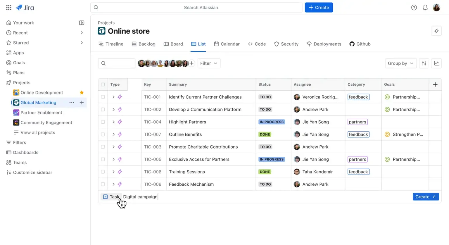 Listevisningen var tidligere kun tilgængelig i Jira Work Management; nu er den tilgængelig i alle typer Jira-projekter, inklusive softwareprojekter. Denne visning gør det muligt at visualisere arbejde i tabelformat og redigere information i opgaver uden at åbne de tilsvarende opgaver.